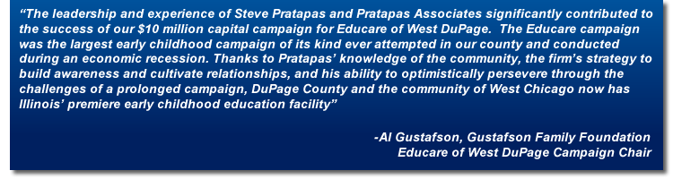 During the height of the 2008 recession, Educare of West DuPage embarked on an ambitious $10M capital campaign to build the first suburban Educare Center in the country. The new early childhood education and development center, targeted for the community of West Chicago, IL, would serve 150 children from the county’s lowest income families. The Educare campaign was anchored by the vision and leadership of Al Gustafson and the Gustafson Family Foundation. However, this venture capital initiative lacked an existing donor or volunteer leadership base to draw upon for support.